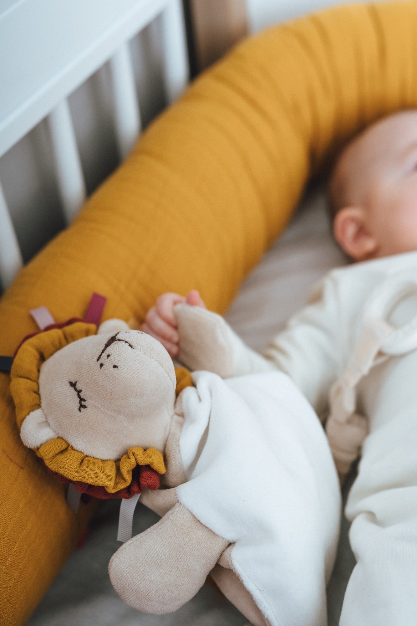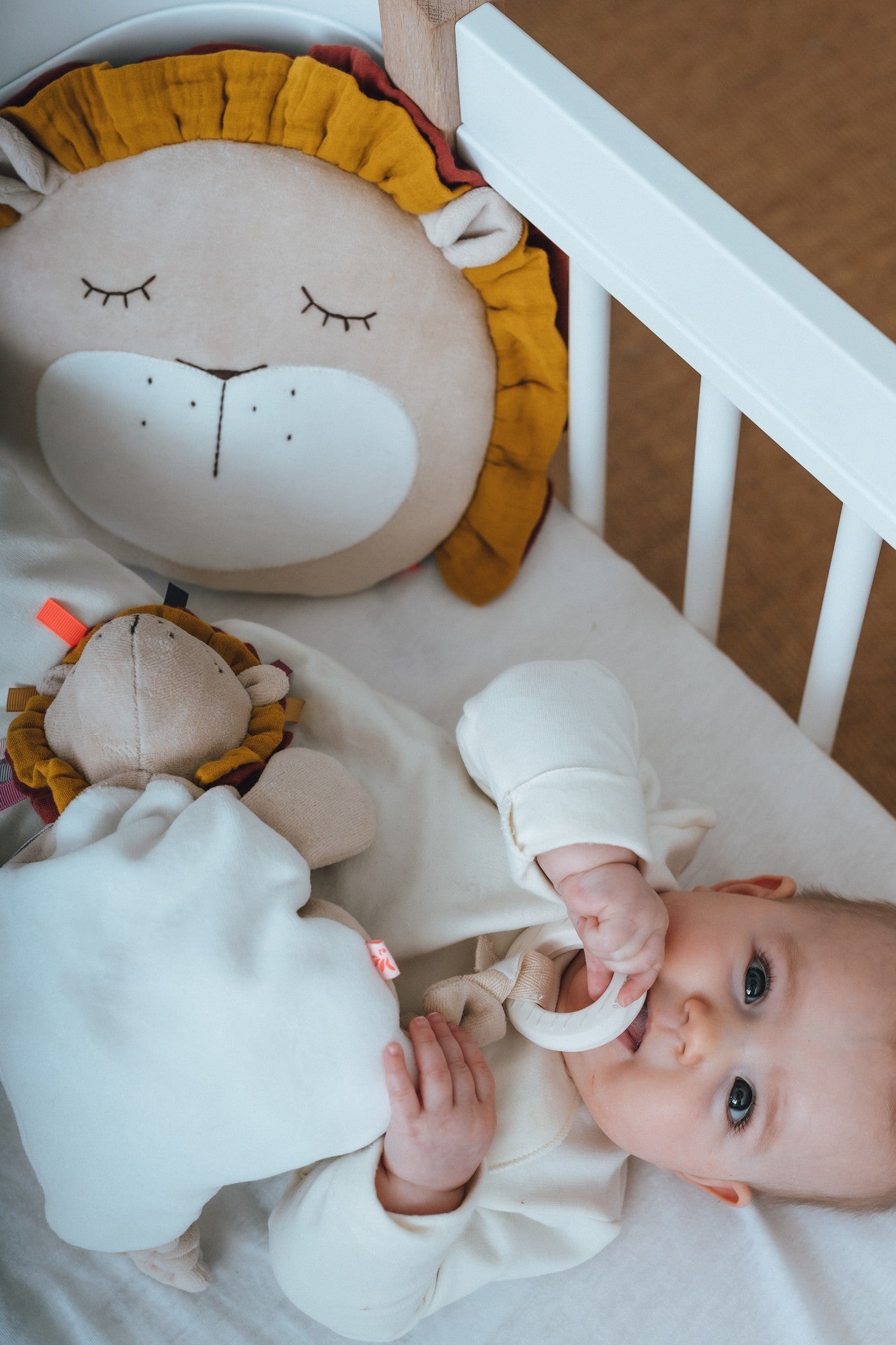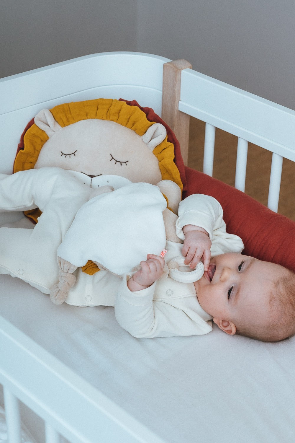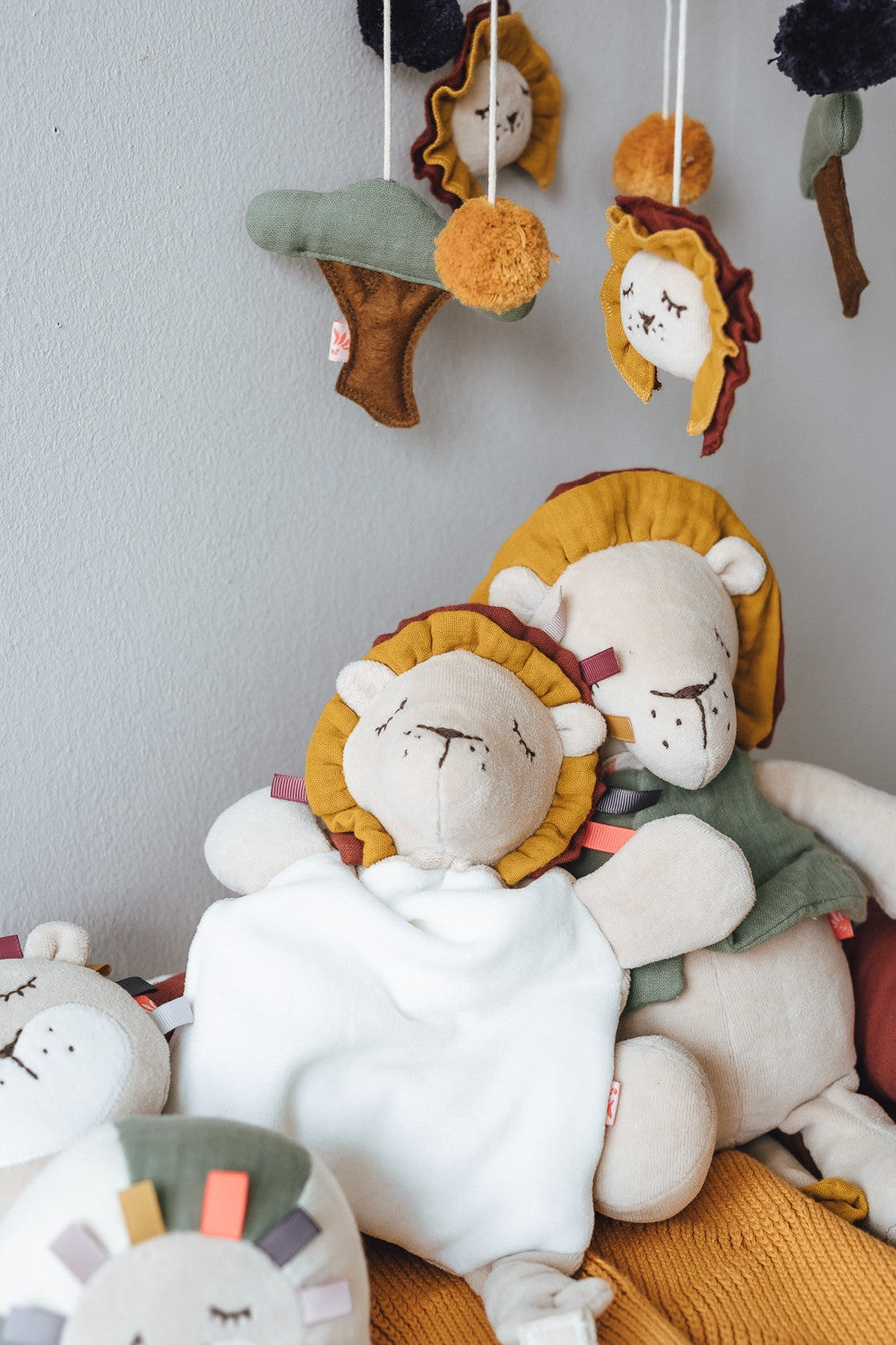 Rund um den Löwenkopf befindet sich eine auffällige Löwenmähne mit vielen bunten Schlaufen, an denen Ihr Baby gerne mit seinen Fingern spielen wird.