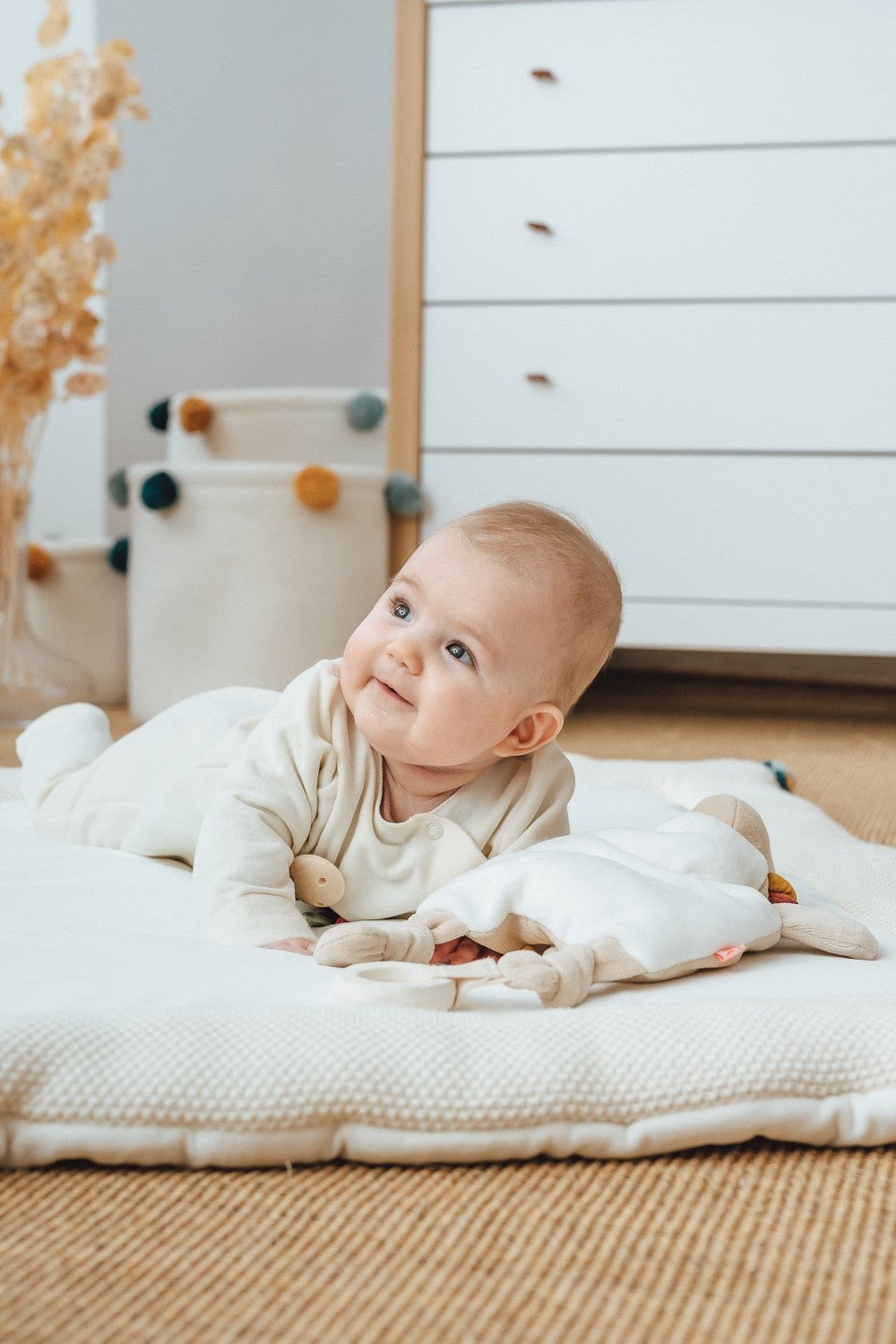 Sein Körper aus kuschel- weichem Nicki lädt zum Schmusen ein, dabei entdeckt Ihr Baby neben der Knisterfolie und einem Quitscher auch einen großen Ring aus Naturkautschuk.