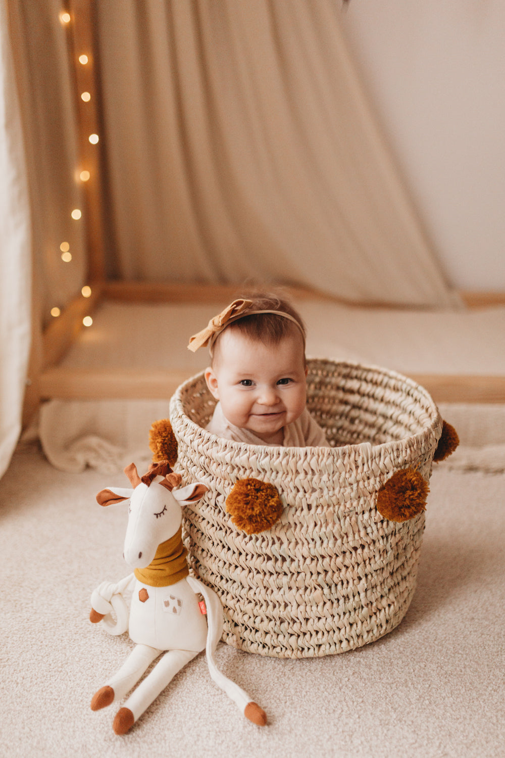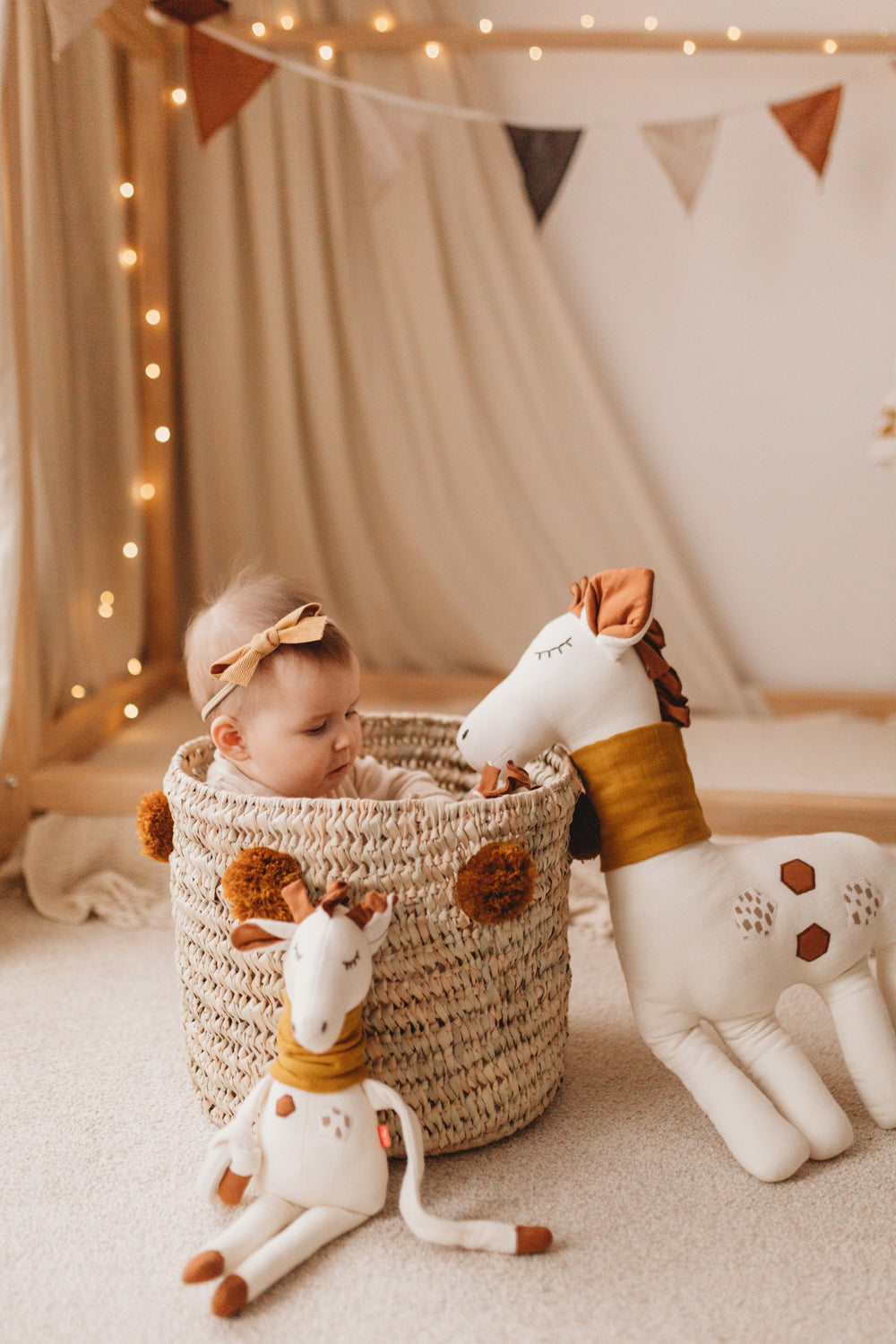 Das Aktivitätsspielzeug Giraffe von Kikadu, ist besonders gut für dein Kleinkind geeignet, wenn es anfängt, sich selbst zu beschäftigen und die Welt neugierig entdeckt. Es bietet vielseitigen Spielspaß: Im Kopf der Giraffe befindet sich eine Glocke, die Ohren knistern und im Hals versteckt sich ein Quietscher. Aber damit nicht genug. Zieht man am Schwanz, zappelt die Giraffe und am Beißring aus Naturkautschuk kann geknabbert werden. Langeweile? Nicht mit diesem unterhaltsamen Babyspielzeug. Maße: 42x16x7,5cm. Altersempfehlung: ab 3 Monate. Pflege: mit feuchtem Tuch reinigen.