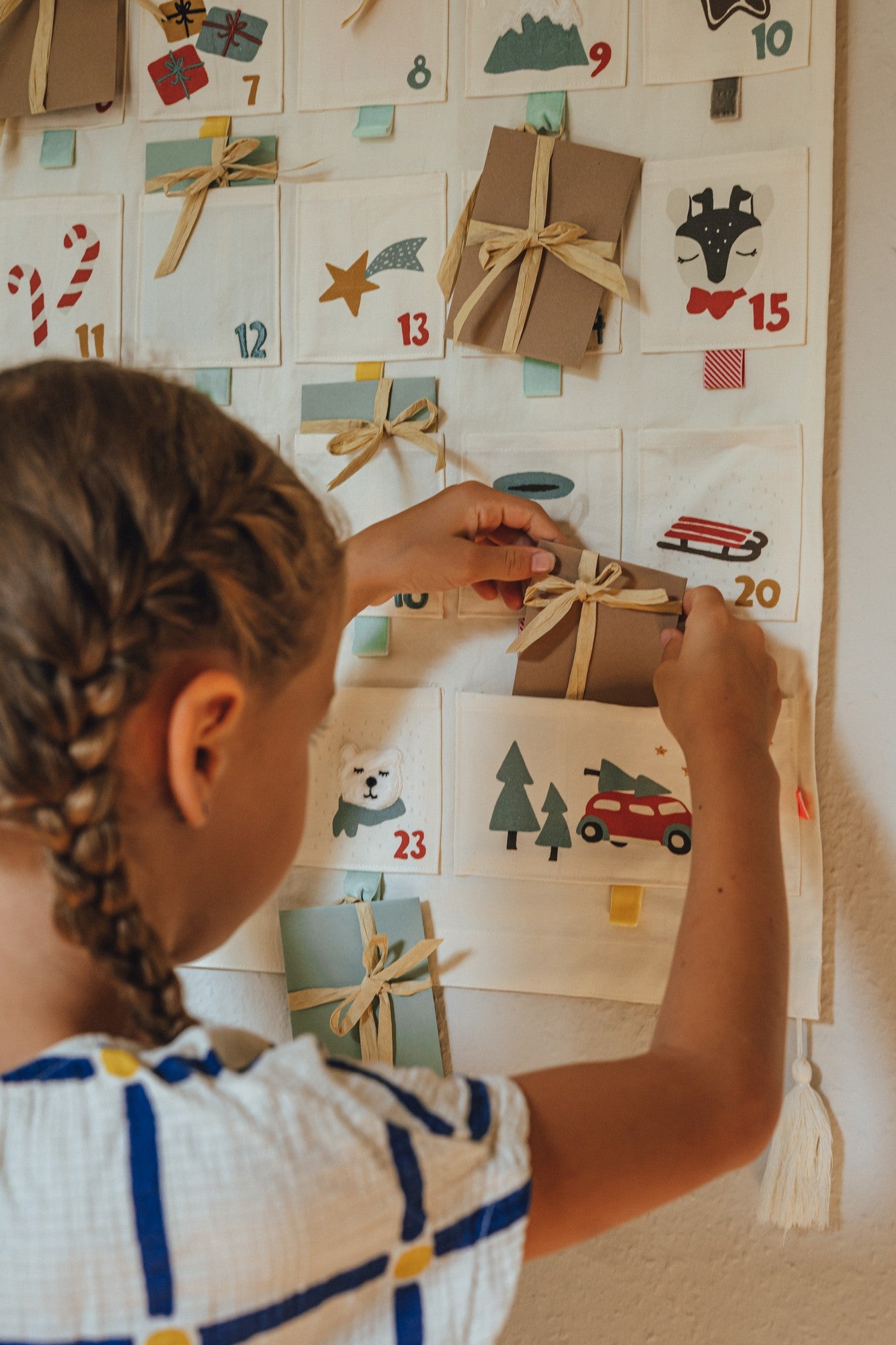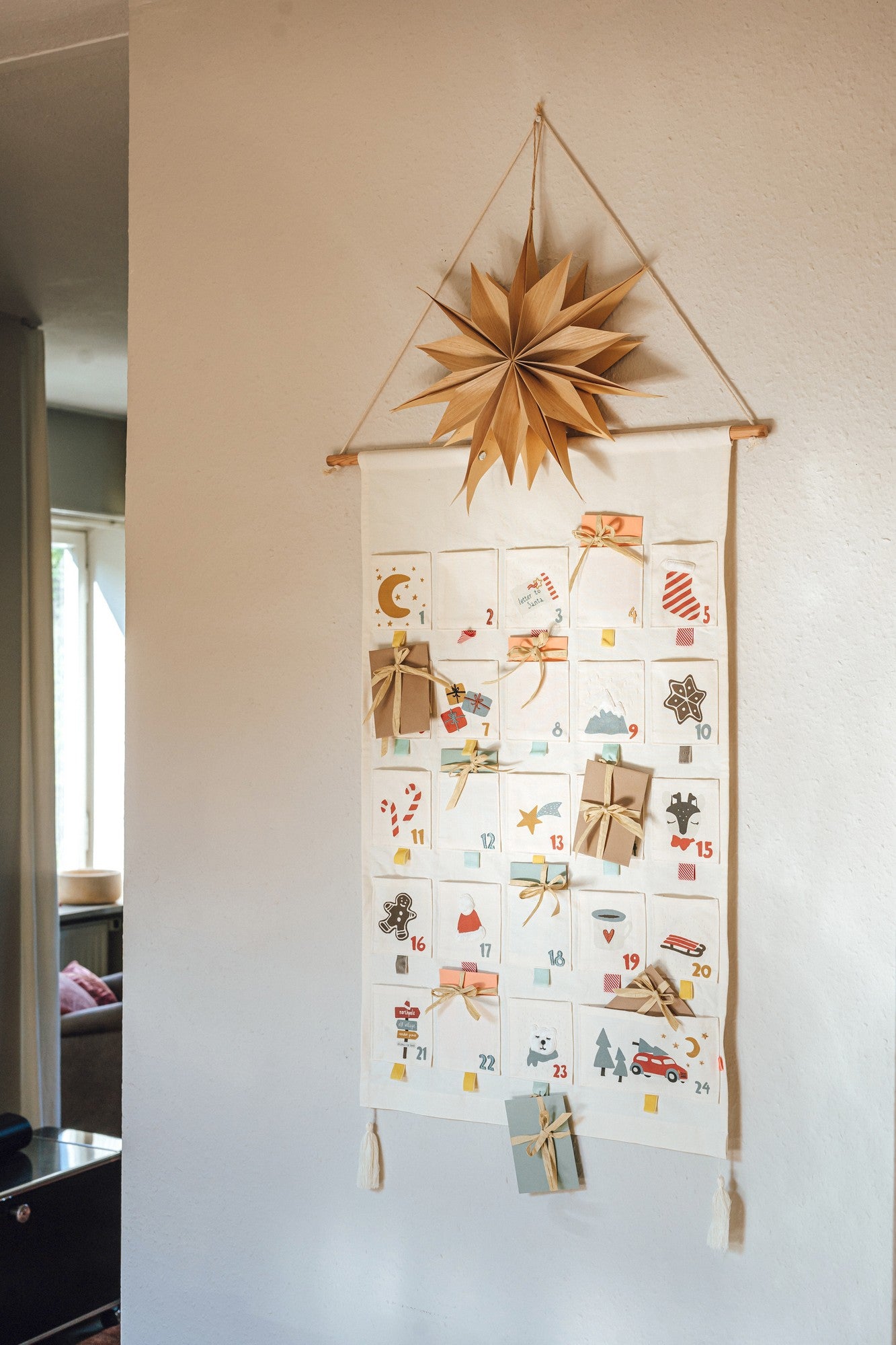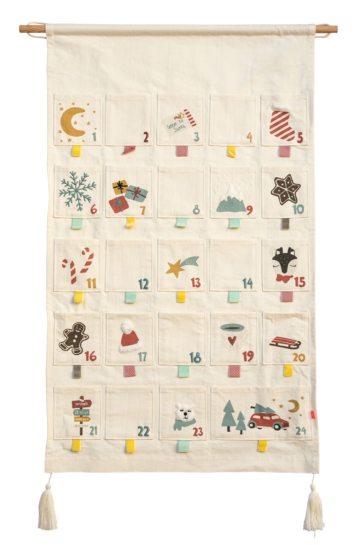 Mit seinen 24 Taschen aus 100% Bio-Baumwolle bietet er Raum für kleine persönliche Geschenke oder Leckereien.