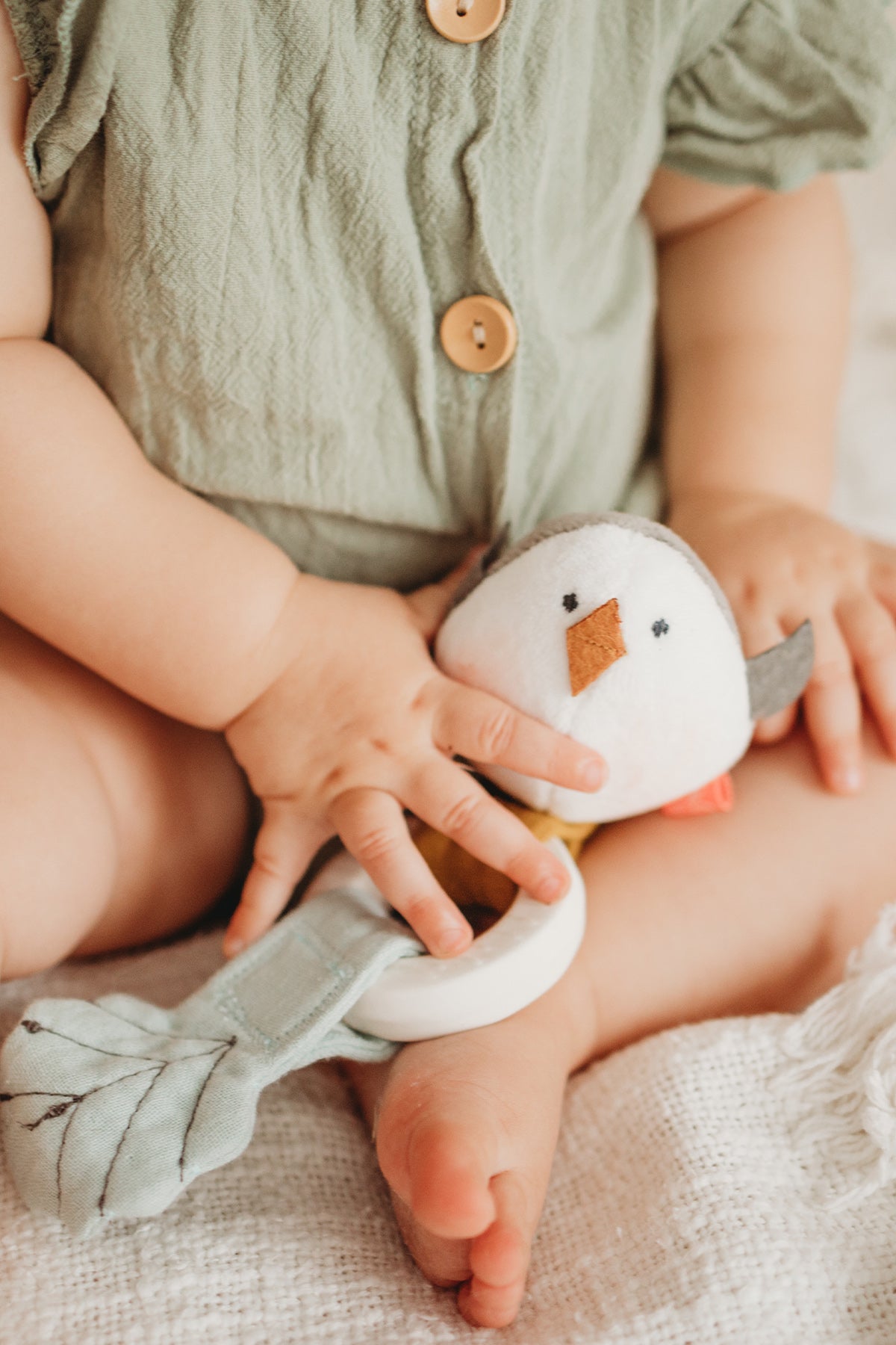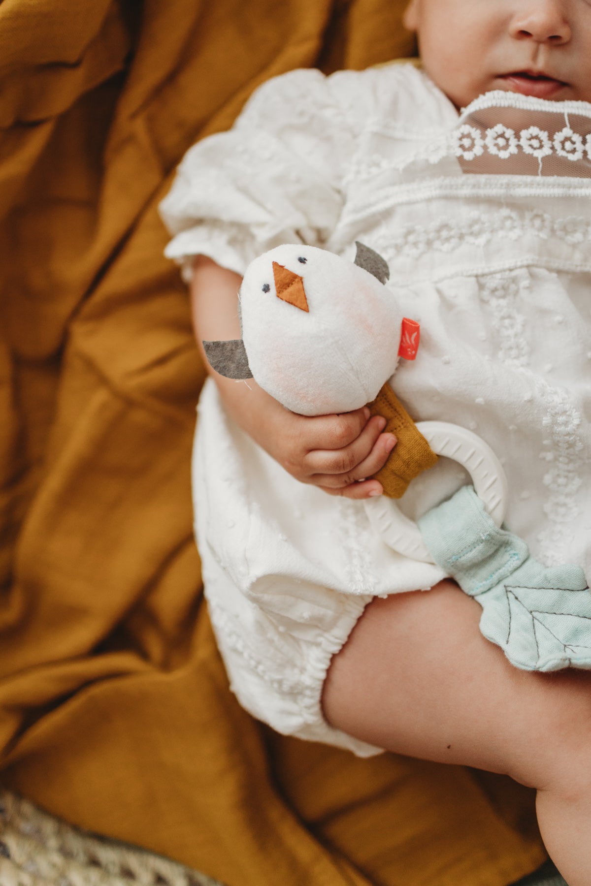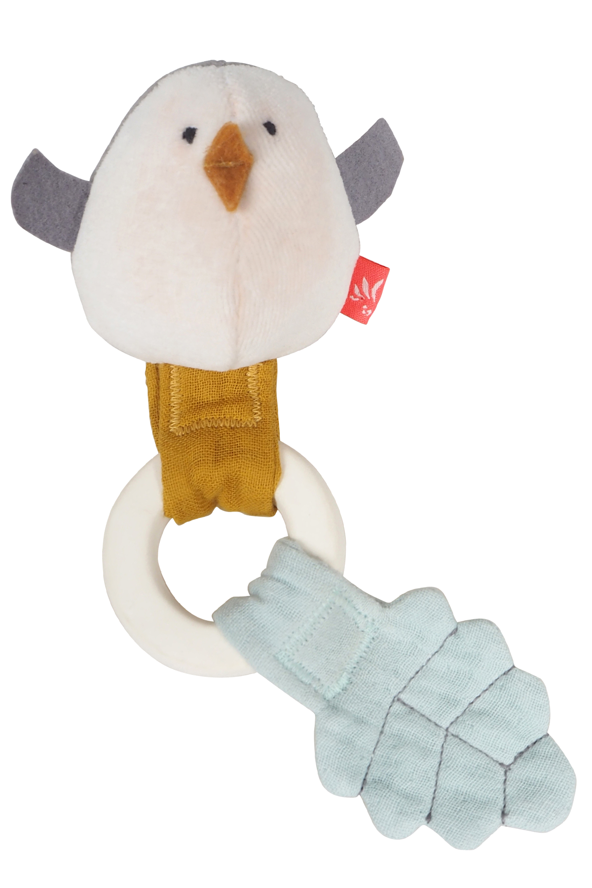 Aber was rasselt denn da an dem Ring? Neben dem Beißring wird das kleine Waldvögelchen die Aufmerksamkeit deines Kindes auf sich lenken. Es sitzt ganz fröhlich auf einem Eichenblatt.