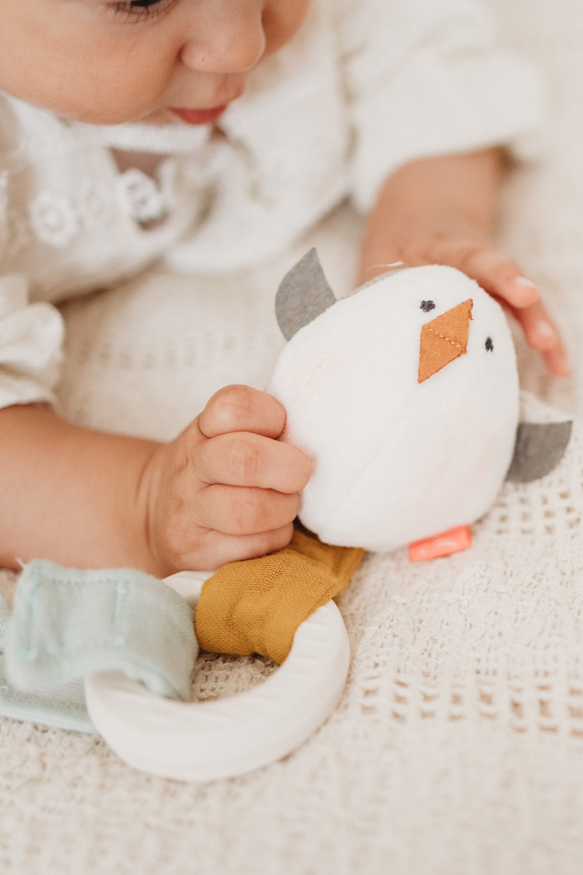 Beißring, Spiel- und Kuschelfreund in einem. Wenn dein Baby zahnt, kann der Beißring aus Natur-Kautschuk helfen, den Kiefer zu entlasten und dein Baby zu beschäftigen.