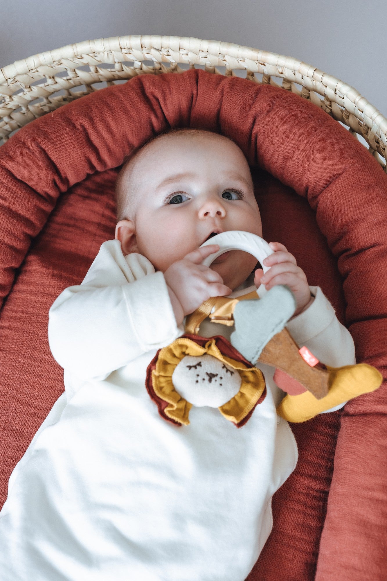 Der Ring aus 100% Natur- Kautschuk dient als Beißring und die drei abnehmbaren Mini Figuren eignen sich hervorragend als Ablenkung.
