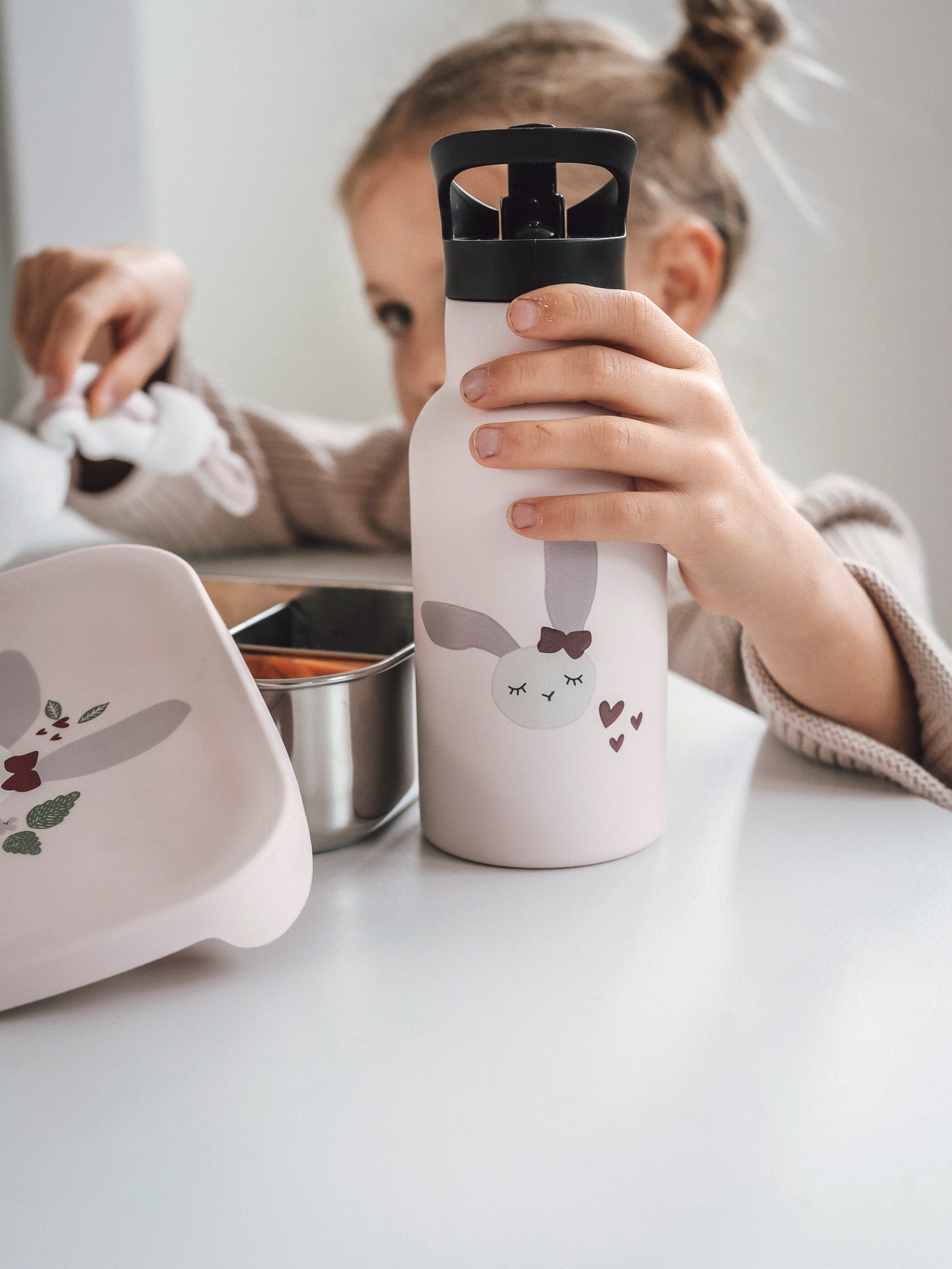 Die Brotdosen sind mit unterschiedlich gestalteten Silikondeckeln erhältlich. Jedes Design gibt es auch als Trinkflasche, Schale, Lätzchen und Platzset.