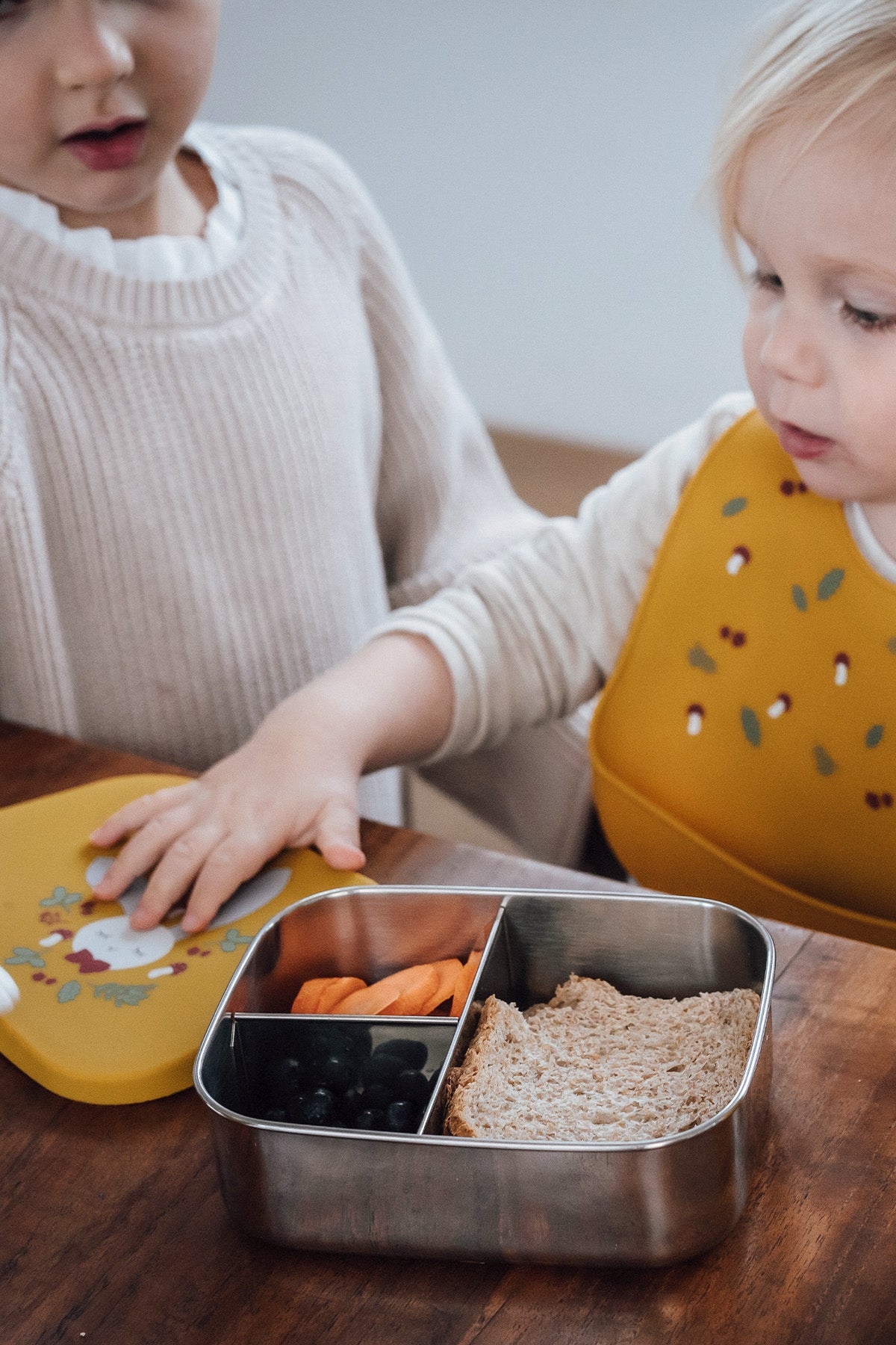Die Brotdosen sind mit unterschiedlich gestalteten Silikondeckeln erhältlich. Jedes Design gibt es auch als Trinkflasche, Schale, Lätzchen und Platzset.