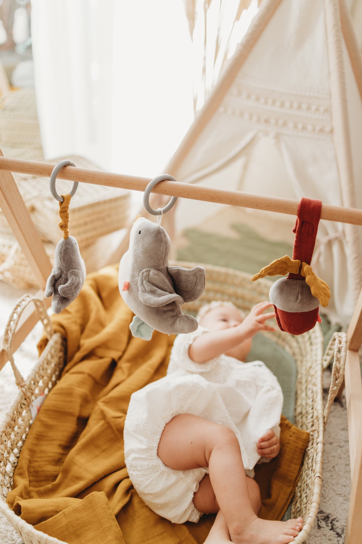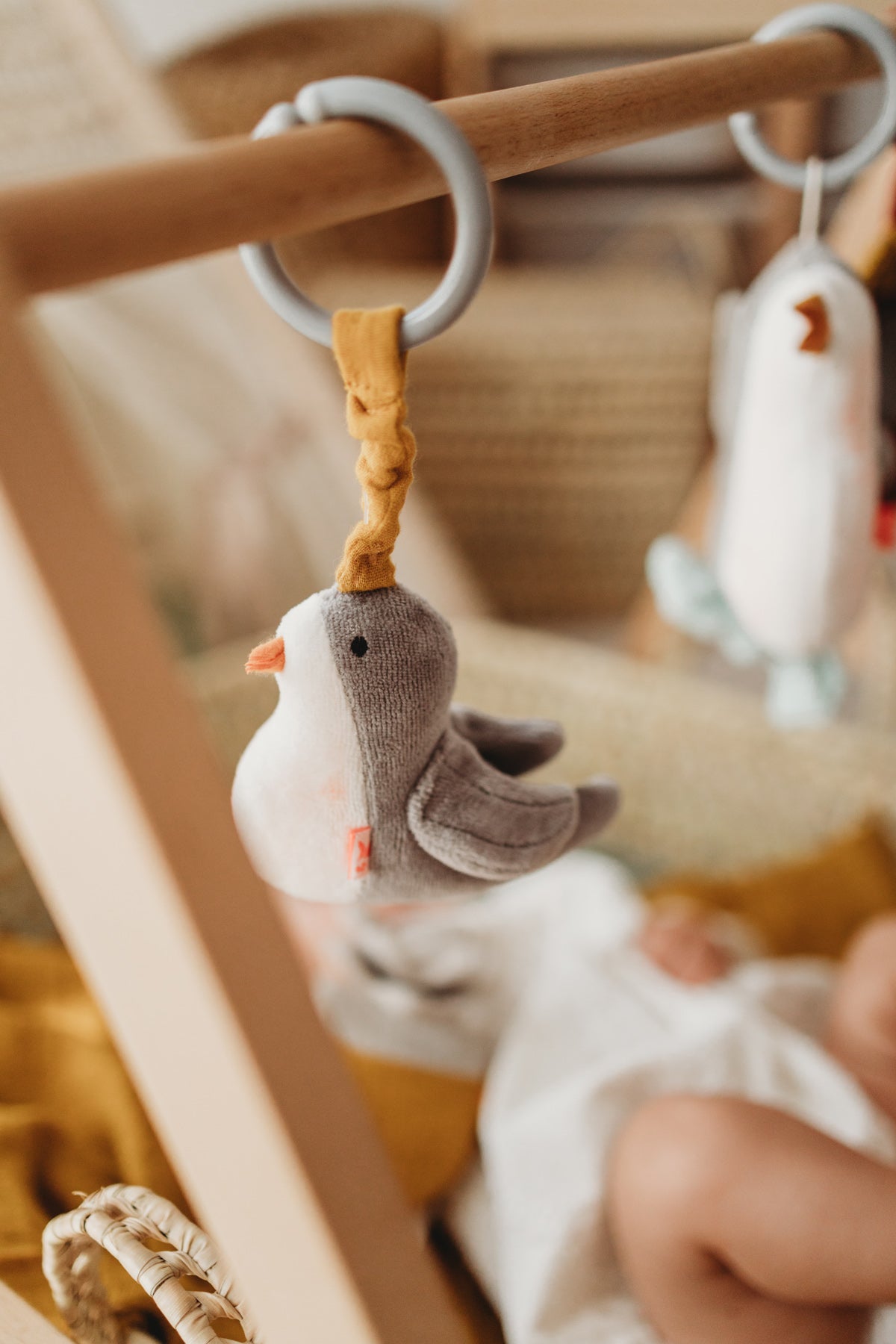 Es baumelt in der Luft und Ihr Baby wird es gerne beobachten. Schüttelt man daran ertönt ein zartes Pfeifgeräusch.