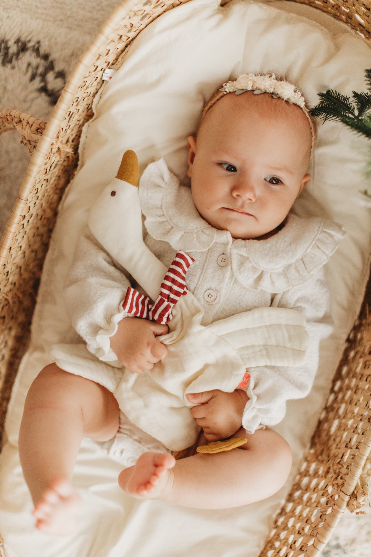 Das schlichte Schmusetuch im entzückenden Gans-Design von Kikadu ist aus besonders weichem Musselin aus Bio-Baumwolle hergestellt und wurde nach den höchsten Standards von GOTS zertifiziert.