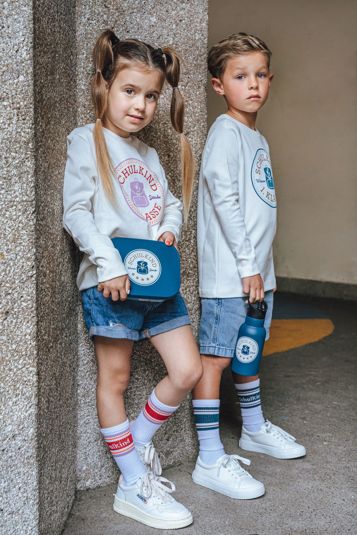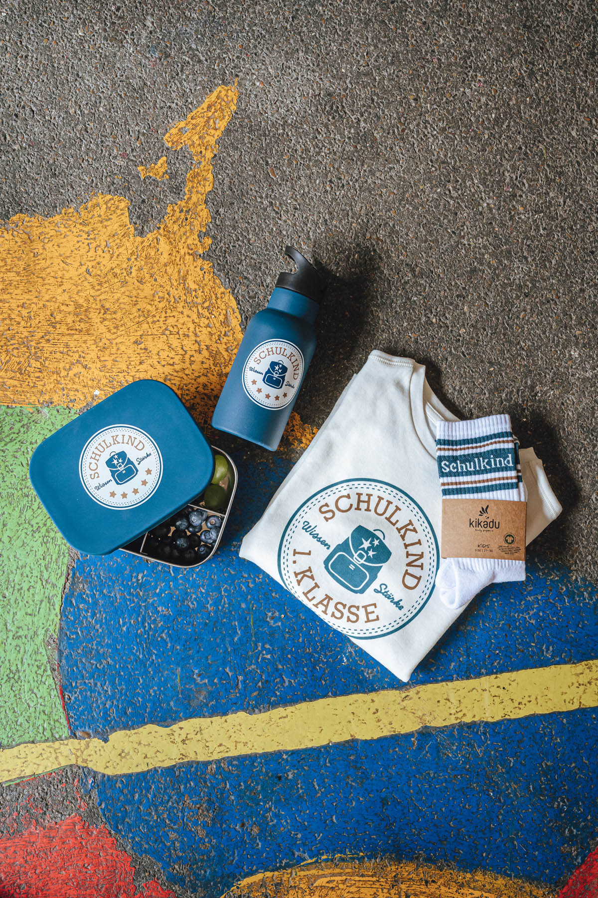 Weitere Artikel für Schulanfänger: Trinkflasche aus Edelstahl, Langarmshirt und Tennissocken aus GOTS zertifizierter Bio-Baumwolle - perfekte Begleiter für den ersten Schultag oder den Schulalltag.
