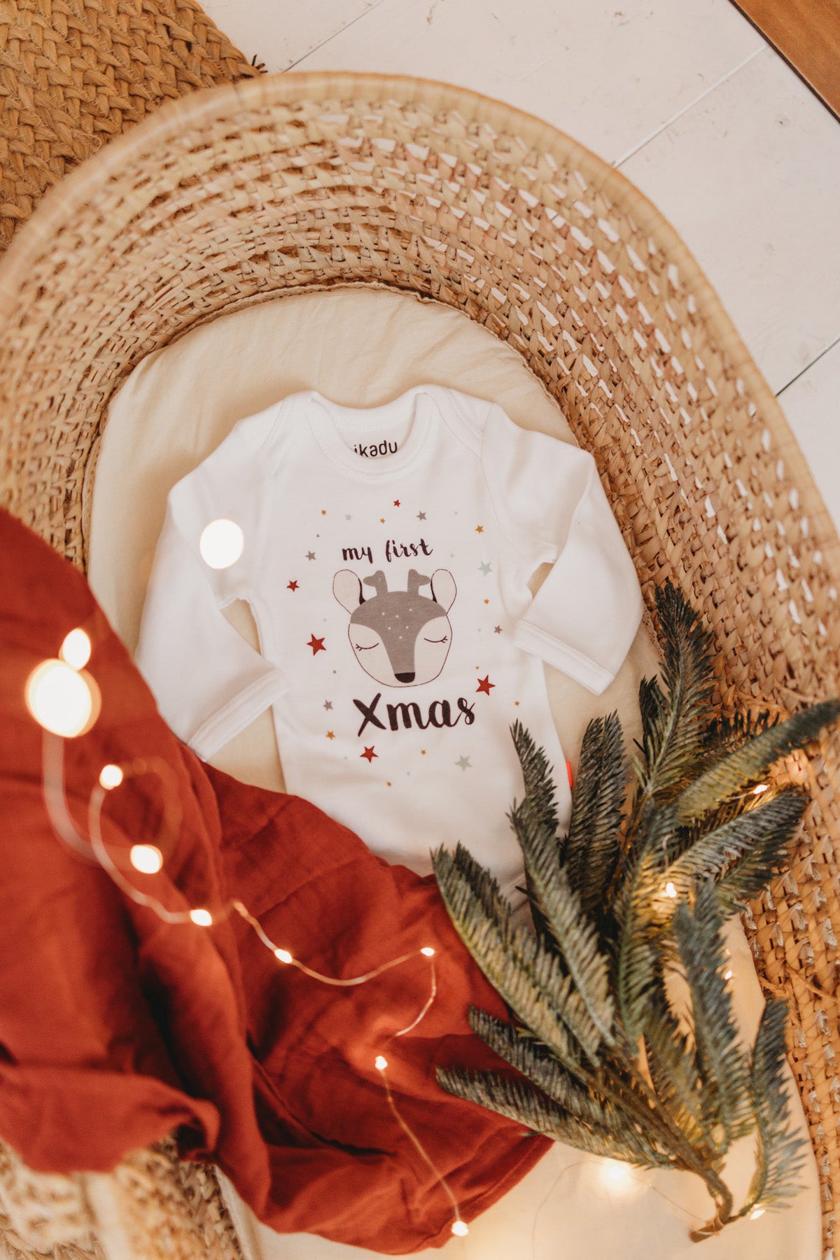 Das erste Weihnachtsfest als Eltern, sollte ganz besonders gefeiert werden. Dieser zuckersüße my first Xmas Body von Kikadu, ist eine schöne Geschenkidee zur Geburt und das perfekte Outfit für die diesjährige Weihnachtskarte. Oma und Opa und auch alle anderen, werden begeistert sein, Ihren Liebling in diesem Outfit zu sehen. Der Body ist aus 100% Bio-Baumwolle. Größe: 74/80. Pflege: Bei 40 Grad waschbar.